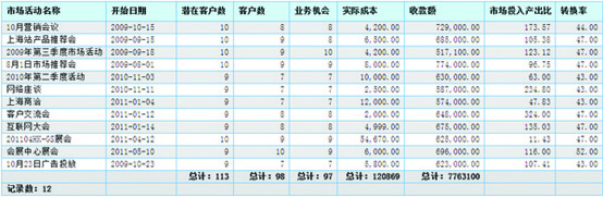 市场人员可以根据系统中市场活动与每个成交客户、每笔回款之间的关联,来统计出哪些市场活动产生的成交客户最多、哪个市场活动投入产出比最高。市场人员再也不需要依靠销售部门就可以知道自己市场活动的投资回报率,然后根据每类市场活动的投入产出比来分配预算。